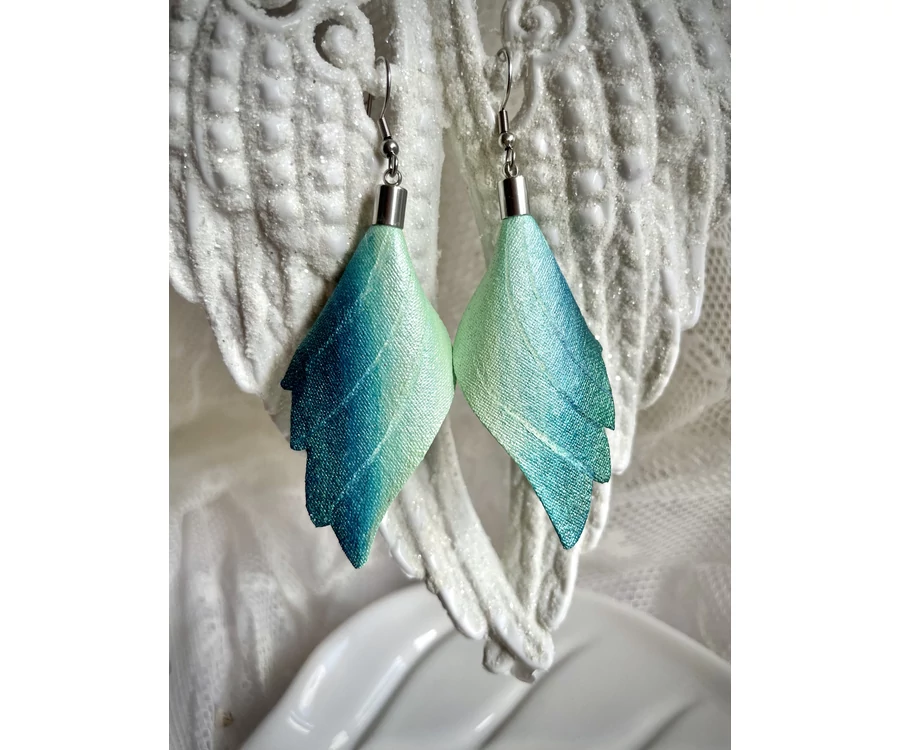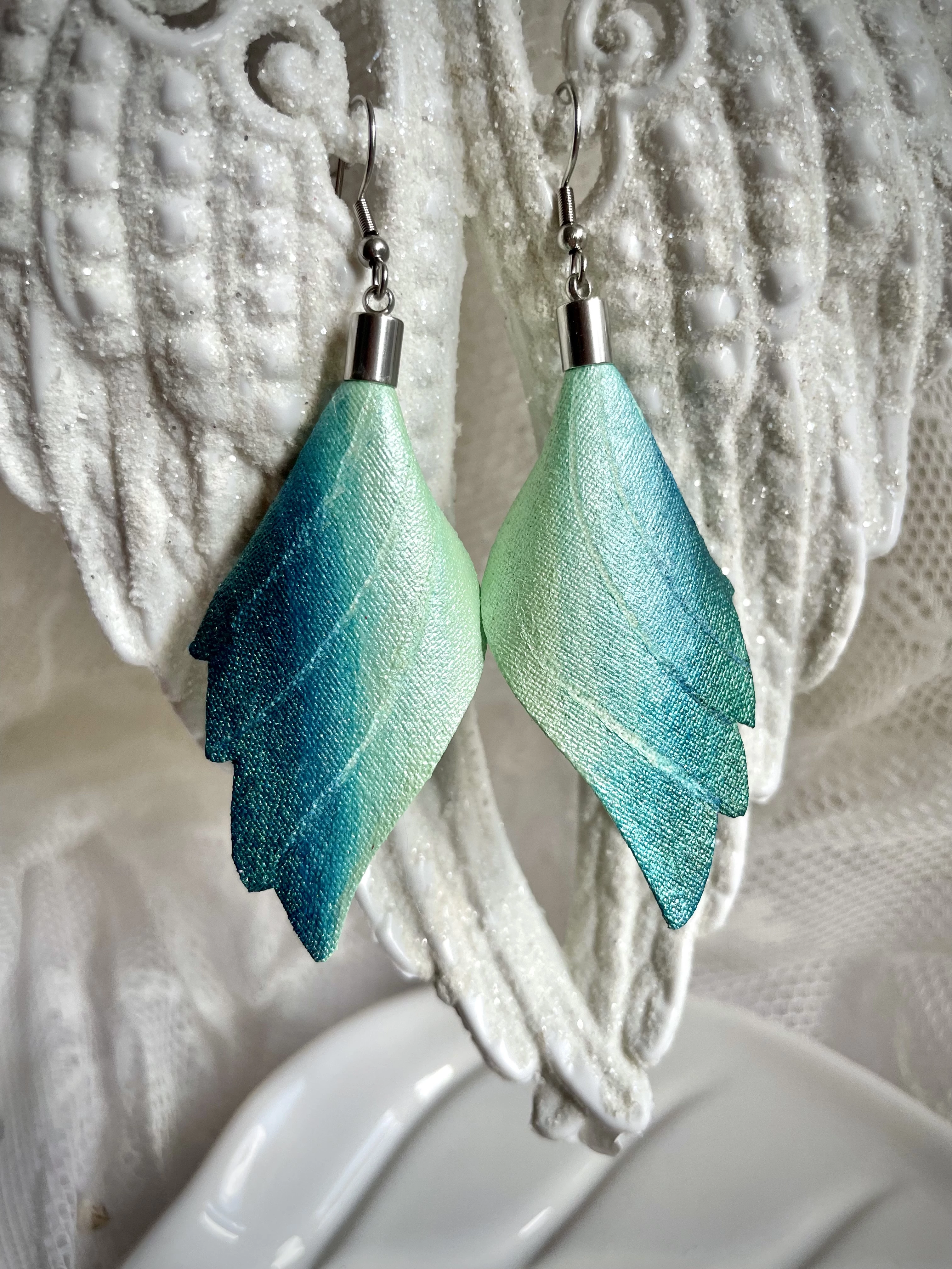 A képen látható fülbevaló egy ragyogó gyöngyházfényű mentából egy sejtelmes mélytürkiz zöldbe hajló árnyalatokban tündököl.