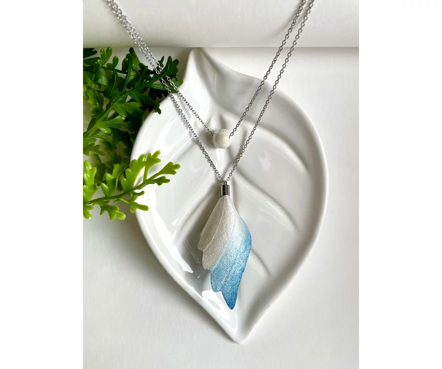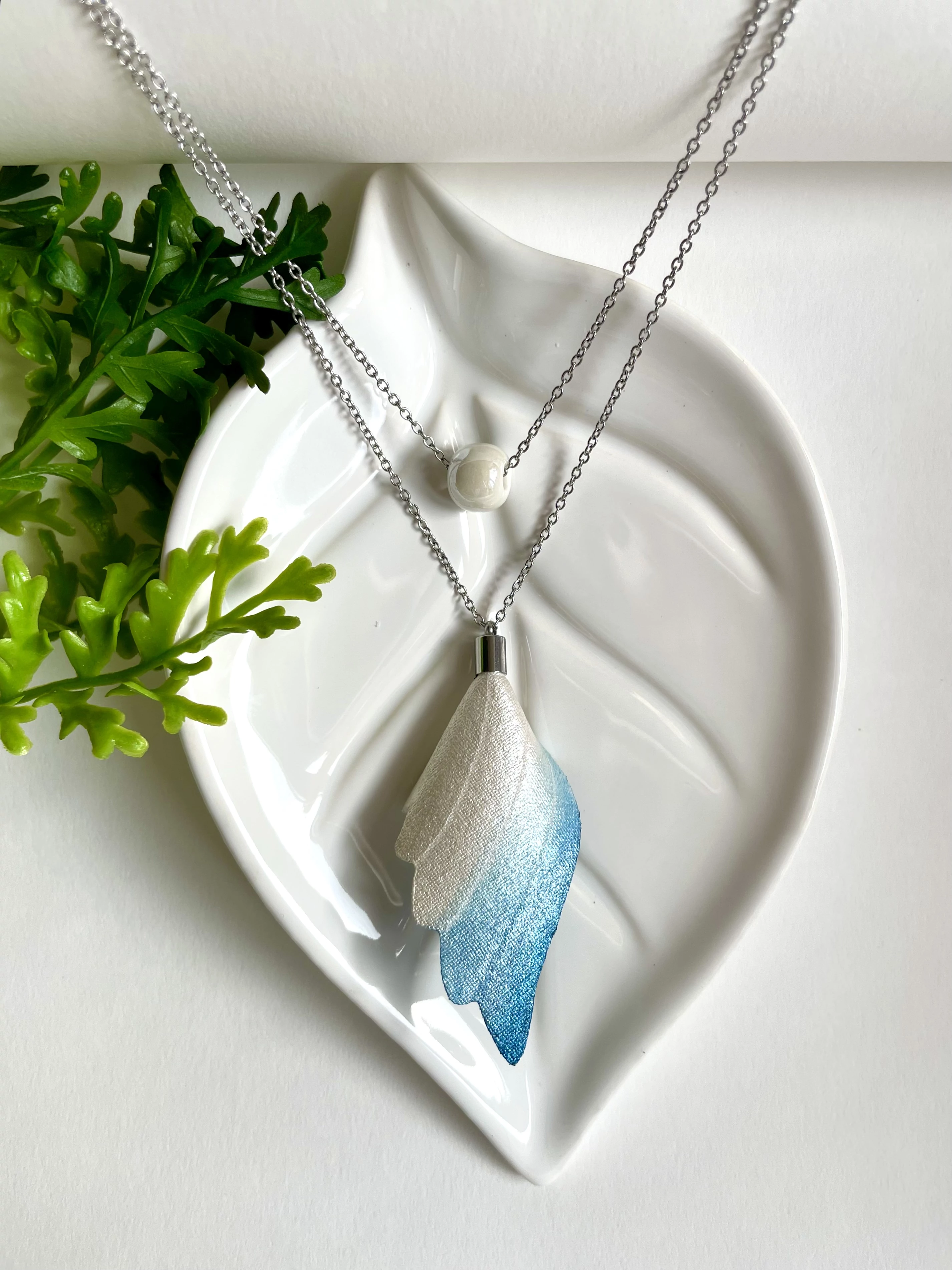 A nyaklánc rendkívül finom vonalvezetésű, kecses és légies darab. Allergiamentes nemesacél szerelékkel készül. A medál textil alapanyagra, kézzel festve készül, emellett pedig egy, a nyak vonalát finoman követő láncon, fényes porcelán gyöngy növeli a nyaklánc kifinomultságát.