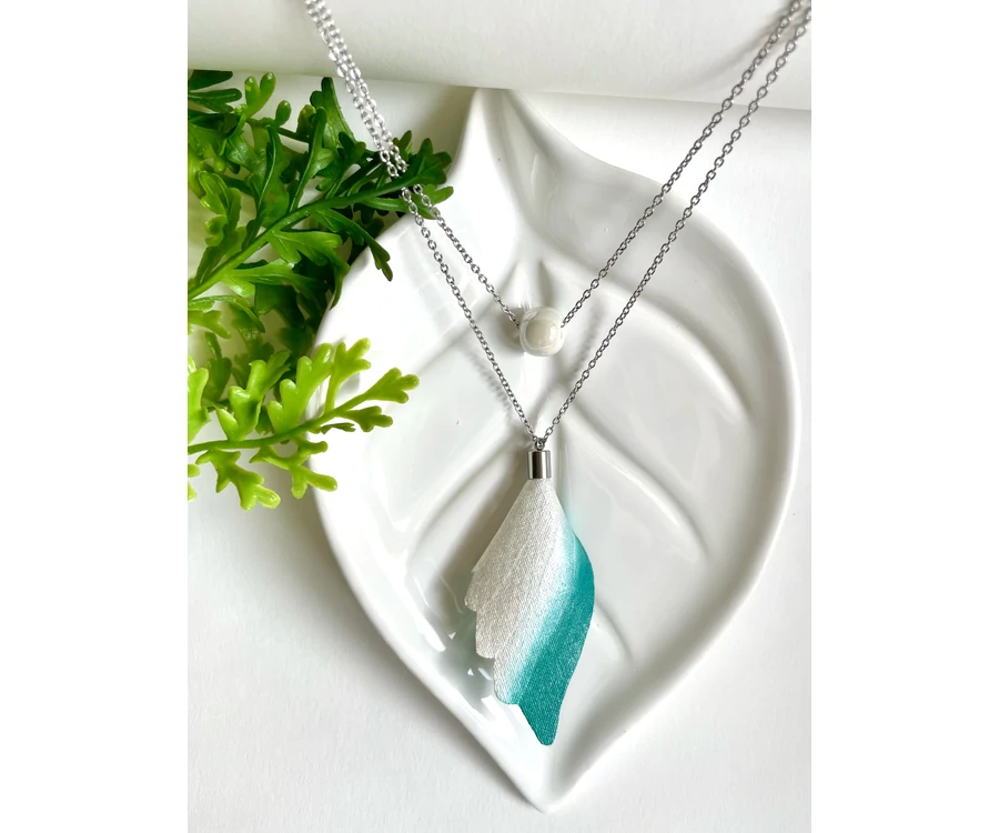 A fülbevaló rendkívül finom vonalvezetésű, kecses és légies darab. Allergiamentes nemesacél szerelékkel készül textil alapanyagra, melyet kézzel festek meg.