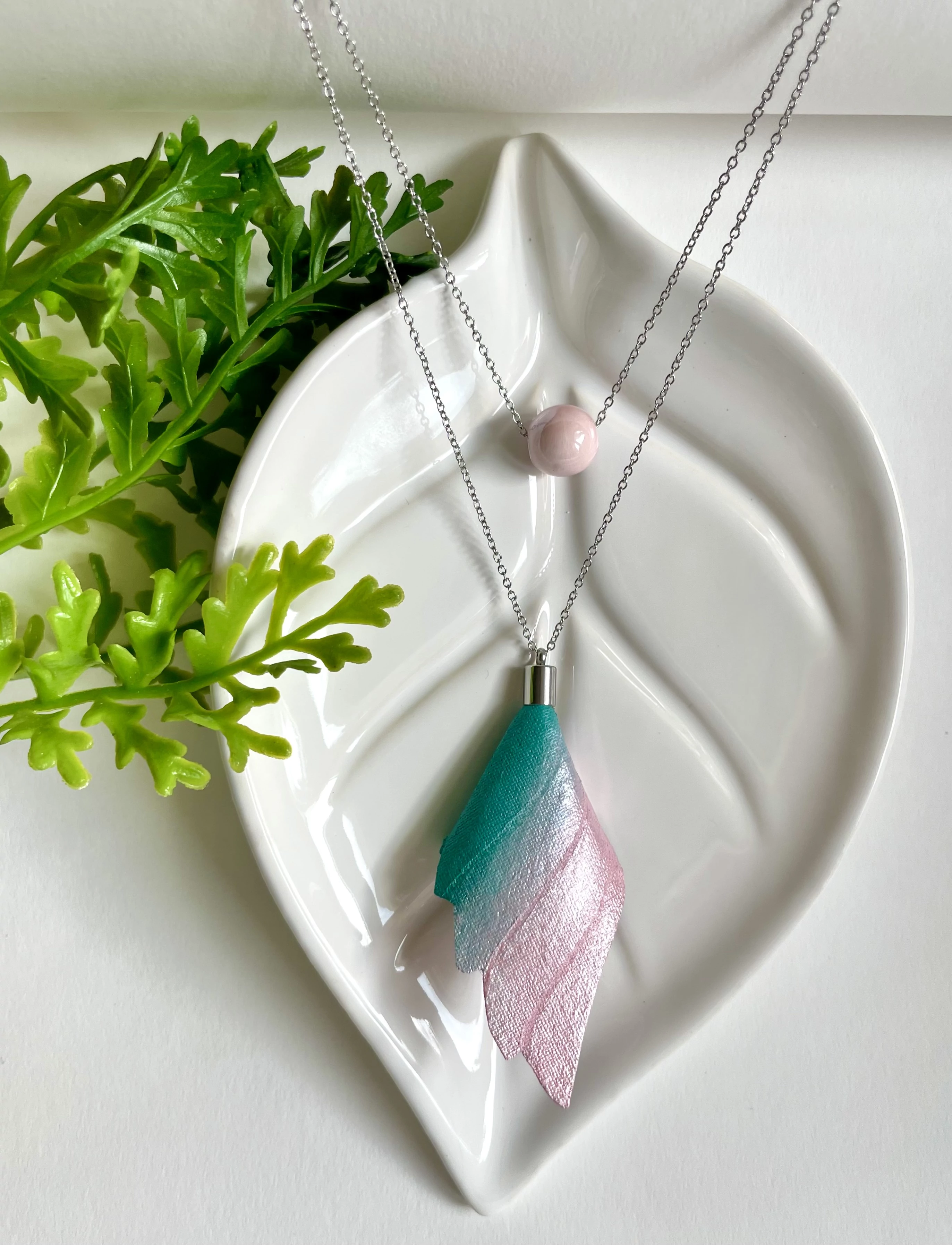 A fülbevaló rendkívül finom vonalvezetésű, kecses és légies darab. Allergiamentes nemesacél szerelékkel készül textil alapanyagra, melyet kézzel festek meg.